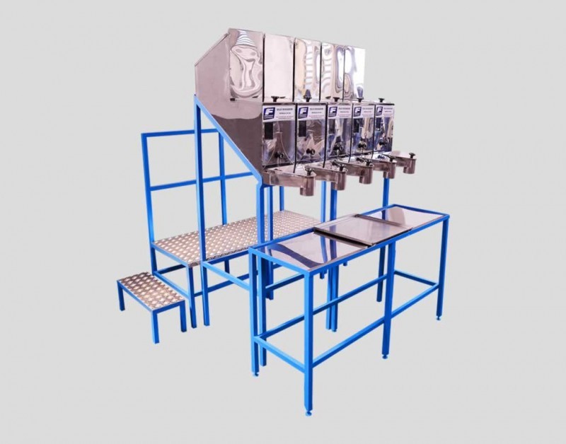 Características: O Silo Dosador foi desenvolvido com um sistema de alimentação e dosagem de compósitos granulados, para injeção de solas de calçados. Com fundo inclinado, para garantir a vazão do produto, contém banddeja móvel e sistema de pesagem, possibiilitando agilidade e precisão na dosagem dos diferentes componentes. Silo todos em aço inoxidável, apoiado sobre estrutura tubular pintada. Escadas e acessos com guarda-corpo, para abastecimento do silo.