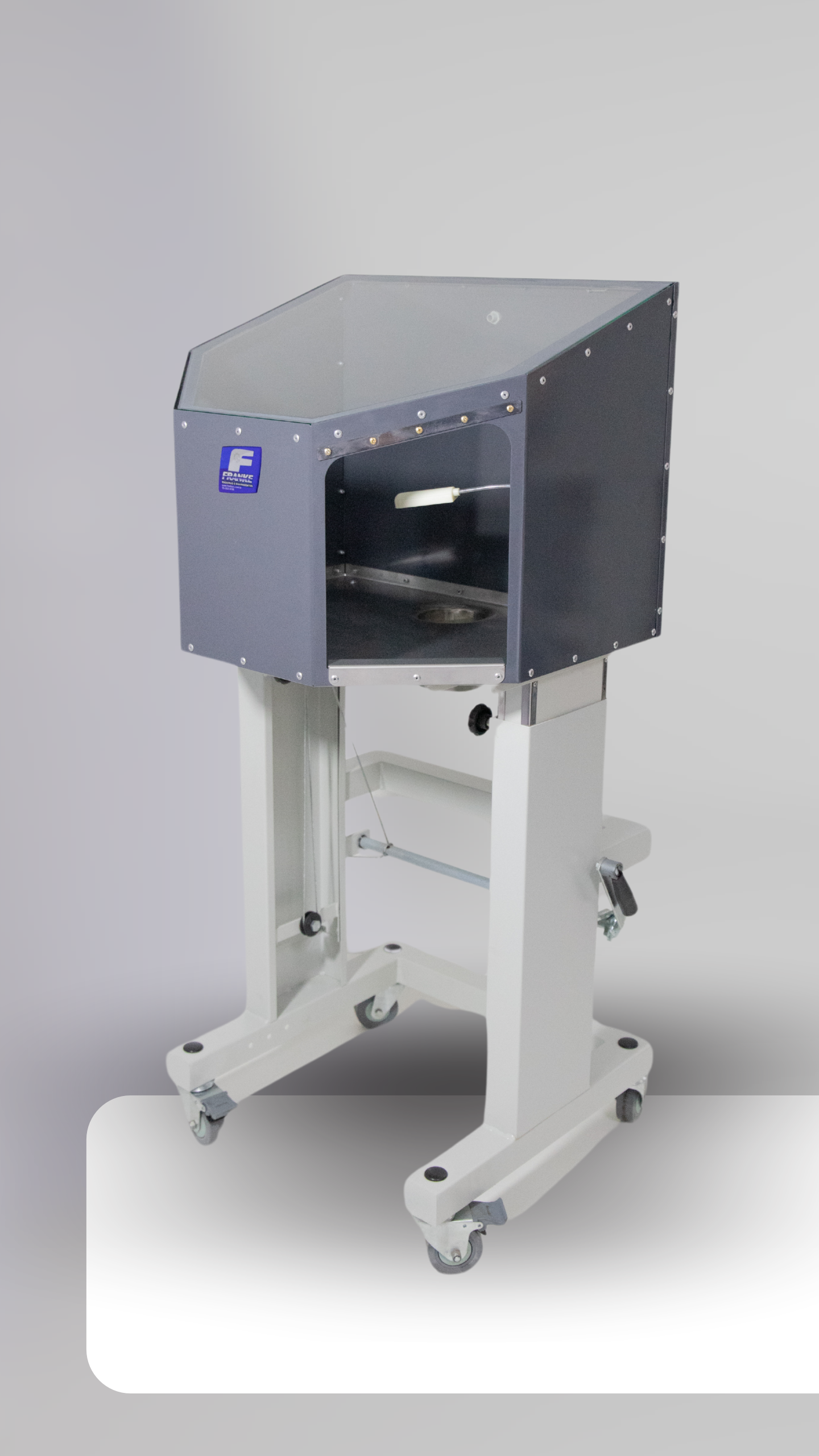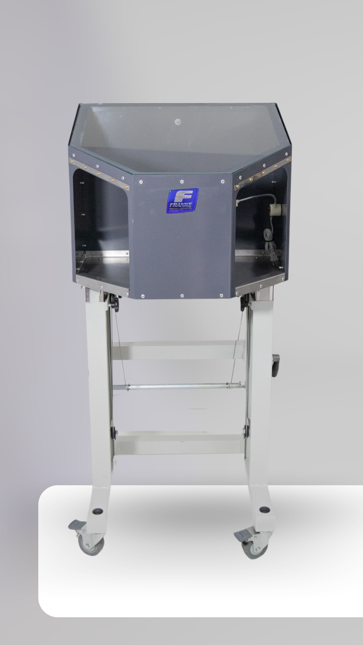 Descrição: A Cabine de Retífica foi desenvolvida para realização de operações de desbaste em componentes do calçado. Conta com local para engate de mangueira de 100mm para ligar o sistema de exaustão de resíduos.Estrutura em aço carbono com pintura epóxi. Instalada sobre mesa ergonômica com rodízios e regulagem de altura, para maior conforto e ergonomia.