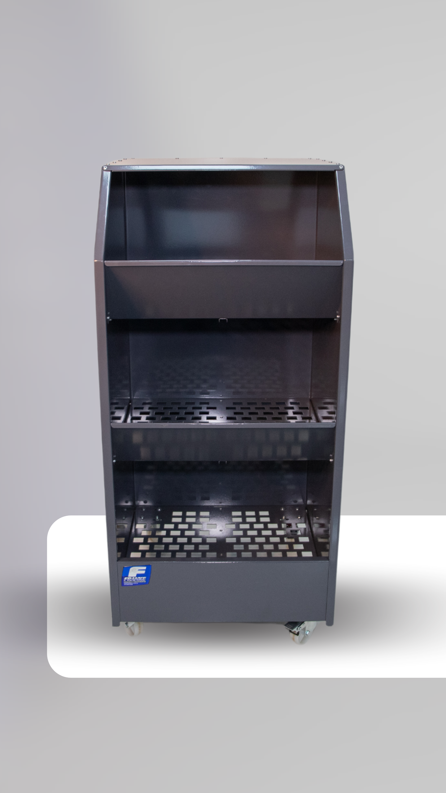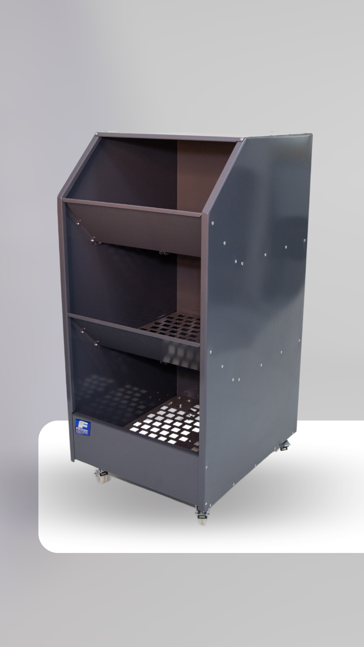 Descrição: O Formeiro em Chapa consiste de uma estrutura utilizada para transporte e armazenagem de fôrmas, conforme fluxo produtivo do calçado. Estrutura em aço carbono com pintura epóxi, conta com rodízios para maior facilidade de movimentação e instalação.
