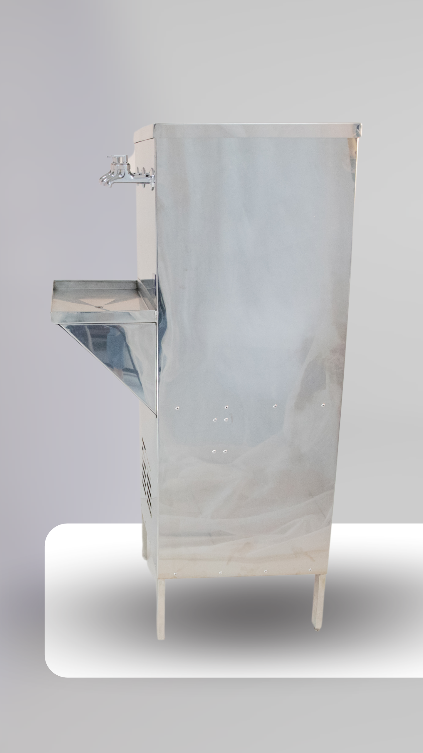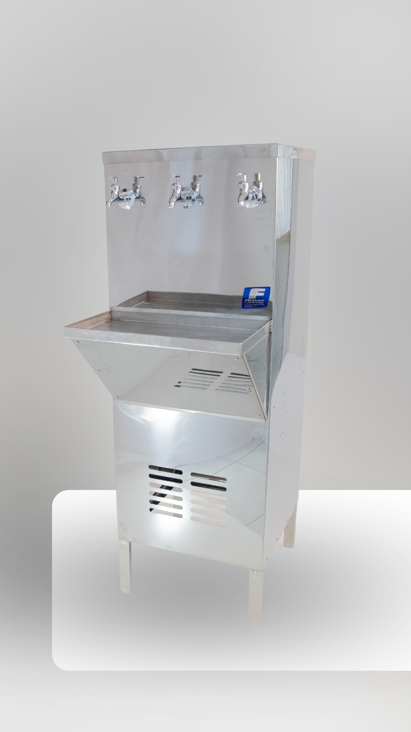 Descrição: O Bebedouro de Água 1 Bandeja consiste de um sistema de refrigeração de água, para consumo humano. Apresenta três torneiras para enchimento de copos ou garrafas. As torneiras são dispostas na parte frontal do bebedouro. Conta com serpentina em inox 304 para condução da água de consumo. Toda estrutura produzida em Aço Inox 430 e Bandejas produzidas em aço inox 304, garantindo alta durabilidade.Equipamento de acordo com exigências da norma NR-12, contando com Laudo e Manual de Operação e Manutenção segura.